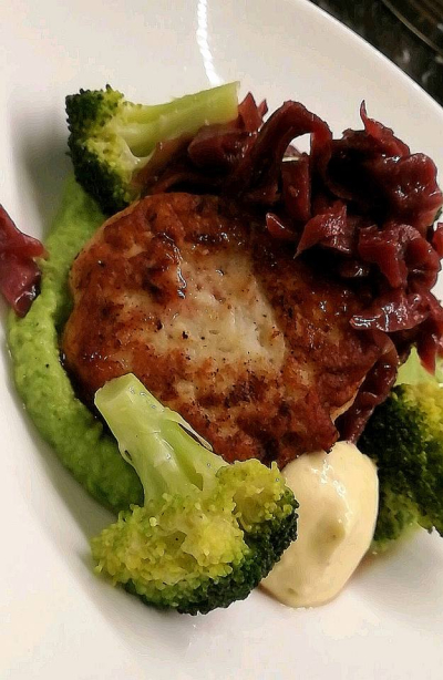 Serveres med erterpuret, syltet rødkål og smørdampet brokkoli.