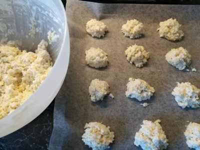 Sett dem med en teskje på et stekebrett med bakepapir og prøv å form dem som små topper.