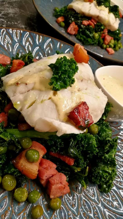Tilsett en god klatt smør i pannen, erter og grønnkål. Vend det inn, smakt til med 2 ts vegeta og pepper etter smak.