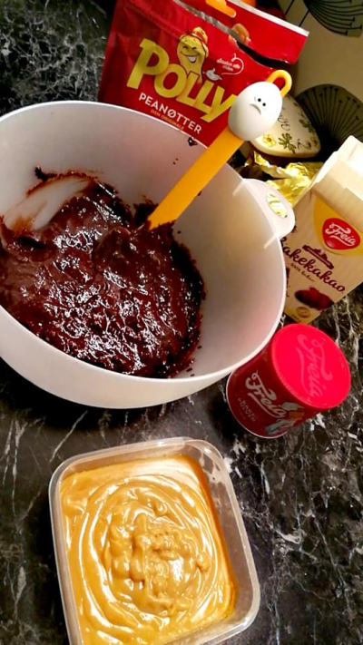 på kjøkkenvekten underveis for å komme frem til nøyaktige mengder og rett smak. Det er jo slik at når sjokoladen smelter under steking