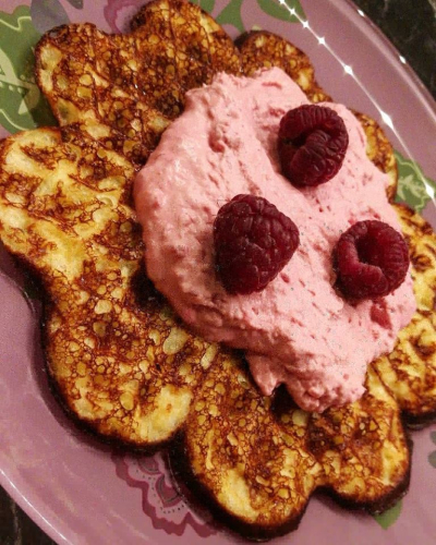 nystekt med rømme og syltetøy på, som vaffeltoast med ost og