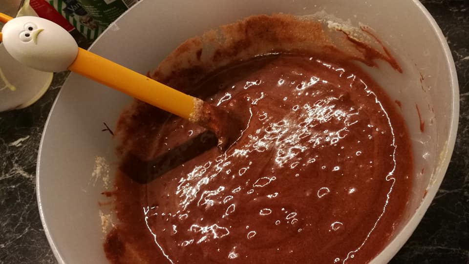 Smelt smøret på svak varme, tilsett sjokolade, vanilje, 3 ss kakao og 4 toppede ss sukrinmelis. Bland dette godt sammen å la dette smelte.