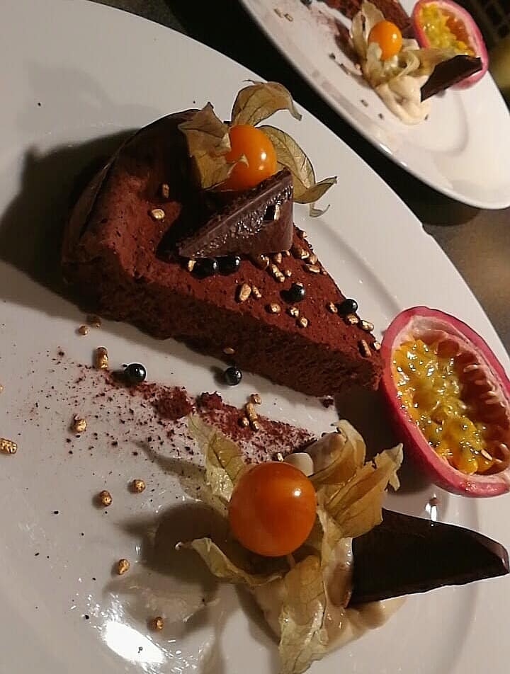 Kaken smaker nydelig sammen med krem, passjonsfrukt og physalis.