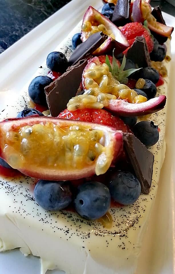 Jeg har pyntet med ferske jordbær, blåbær, pasjonsfrukt og mørk sjokolade.