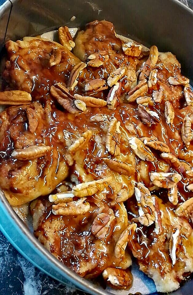 Bland inn litt nøytral olje slik at deigen slipper taket. Kjevles ut som en firkant på et bakepapir. Bre over smeltet sjokolade, et tynt lag syltetøy. Rull deigen sammen ved hjelp av bakepapiret. Skjær deigen i 8-10 emner og fordel emnene i en lien smurt kakeform med bakepapir i bunn. Trykk dem litt ned, hell over fibersirup og topp med pekannøtter.