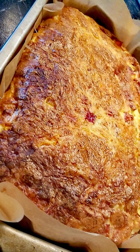 Visp sammen de flytende ingrediensene og rør inn resten av ingrediensene med en sleiv. Smør en liten firkantet form eller en liten paiform og kle formen med bakepapir i bunn. Hell oppi røren og fordel den jevnt utover. Stekes midt i ovnen på 200g på varmluft i 20-25 min, eller til eggeblandingen har satt seg.