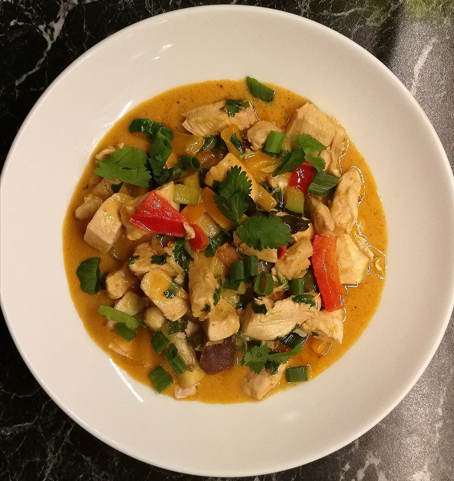 Surr ghee sammen med currypaste i en tykkbunnet gryte i et par min. Tilsett kokoskrem og visp godt. La det putre litt. Tilsett resten av ingrediensene utenom vårløk og koriander og la det småkoke i 5 min. Tilsett kylling og la det putre videre i ca 10 min. Tilsett grønnsaker og la det koke i 6-7 min alt etter tykkelse på grønnsakene. Rør inn vårløk og halvparten av korianderen og trekk gryten bort fra platen. Sjekk at kyllingen er kjennomkokt!
