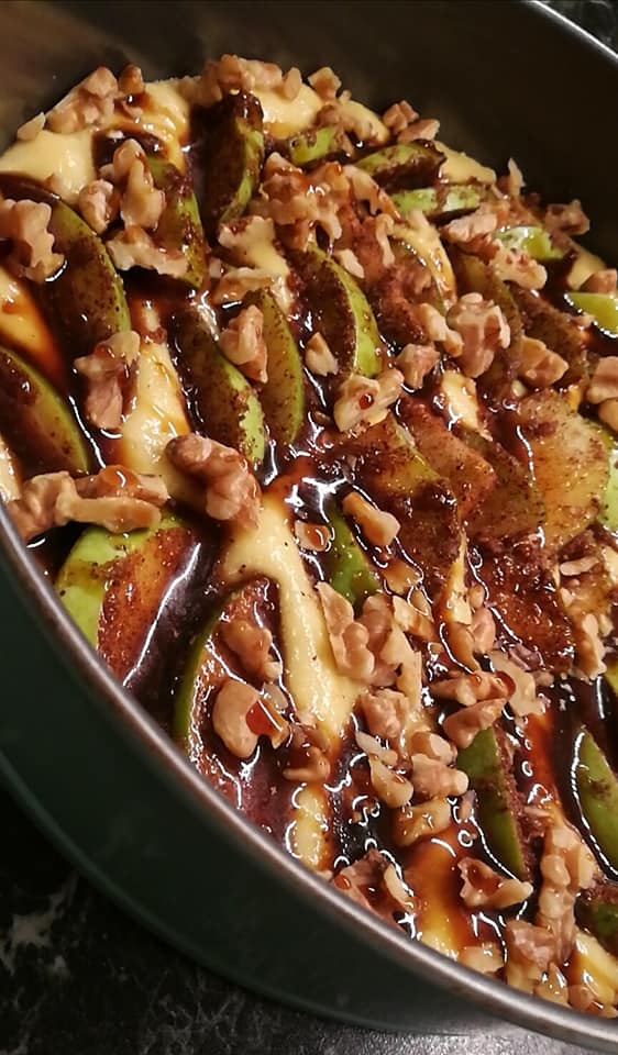 Tilsett mandelmel og egg og rør det godt inn. Bland inn litt nøytral olje slik at deigen slipper taket. Ha bakepapir i bunn på en liten springform og smør formen godt. Trykk deigen forsiktig utover. Ha epleskivene i en pose sammen med 3 ss sukrin gold og ønsket mengde kanel. Rist godt. Fordel epleskivene utover og trykk dem litt nedi. Strø over grovhakkede valnøtter og hell over yaconsirup. Jeg topper med mer kanel da jeg bare elsker smaken av skikkelig caylon kanel sammen med syrlig eple. Stekes i midten på over og undervarme i 180 grader i 20 min. Avkjøles i formen.