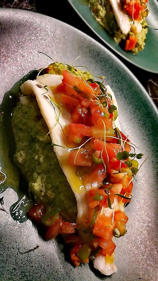 Ha brokkolipure på tallerken, legg oppå fisk og dander salsa over fisken. Topp med mikrogrønt om du får tak i.