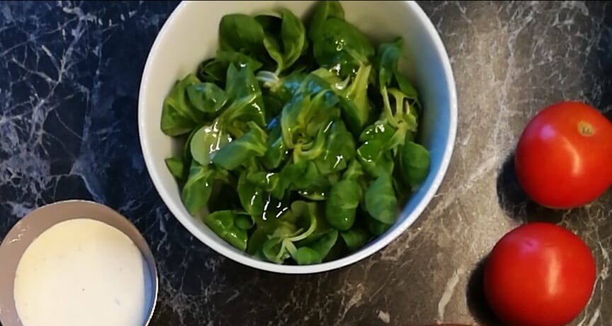 Tilsett 2 ts vegetakrydder, 1/2 ts havsalt, litt ferskmalt pepper og 1 fedd revet hvitløk i 2 dl rømme. Rør godt om og la dressingen stå i et par min slik at smaken setter seg før servering.