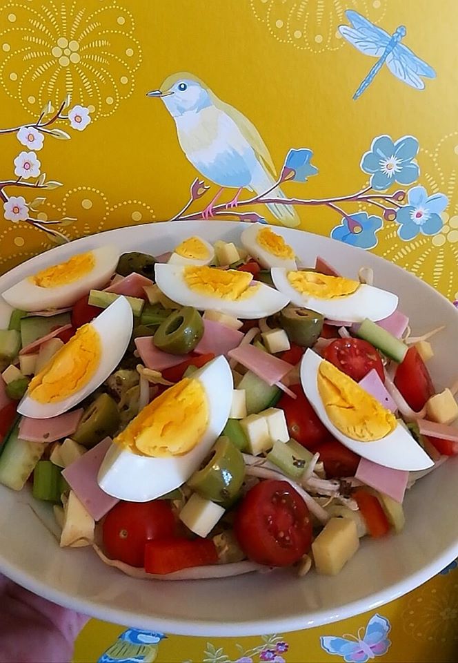 Finkutt ønsket mengde salat og bland den godt sammen med halvparten av dressingen i en bolle. Ha salaten i en stor skål eller på en tallerken og dander resten av grønnsakene over salaten. Ha over skinke og ost og pynt med egg. Hell over litt olivenolje. Resten av dressingen serveres ved siden.