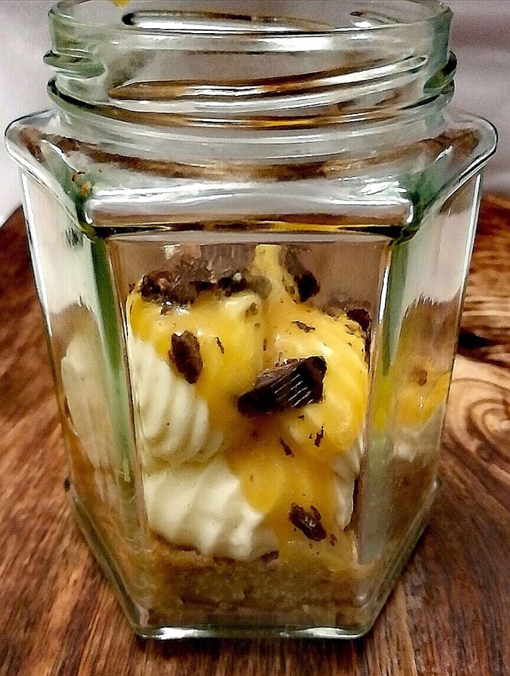 Lag gjerne desserten klar dagen i forveien og topp med karamellsaus og mørk finhakket sjokolade rett før servering. Jeg har brukt Freia Premium 86% sjokolade og bruker sprøytepose til ostekremen.