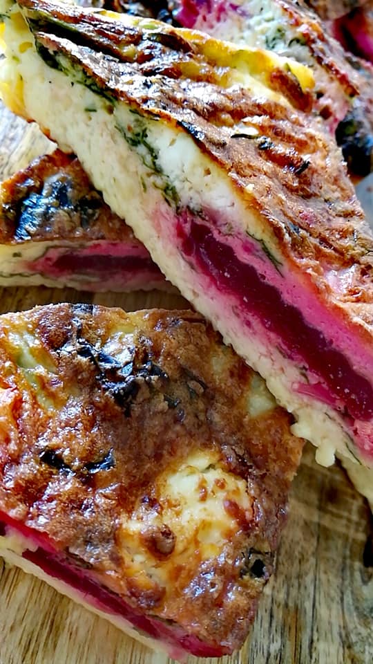 Visp sammen alt det våte og bakepulver til en luftig røre for hånd. Tilsett resten av ingrediensene utenom rødbeter og rør det godt inn. Kle en smurt stor ildfast form med bakepapir og hell røren oppi. Fordel røren jevnt utover og trykk ned spinaten. Fordel rødbete jevnt utover og trykk dem litt ned, slik at de ikke blir brent under steking. Smuldre over chevre og stekes på 200 grader midt i ovnen på varmluft i 30-40 min alt etter ovn. Følg med underveis. Quichen er ferdig når eggeblandingen har satt seg. La quichen avkjøles noe før du slider den utav formen og nyter herligheten. Slukes ikke hele omeletten i en omgang, deler du den opp i porsjoner og oppbevar den i en tett boks med bakepapir mellom lagene. Ps. Blir quichen fort gyllen på toppen under steking, skrur du ovnen på over og undervarme resten av steketiden og legger over et bakepapir!