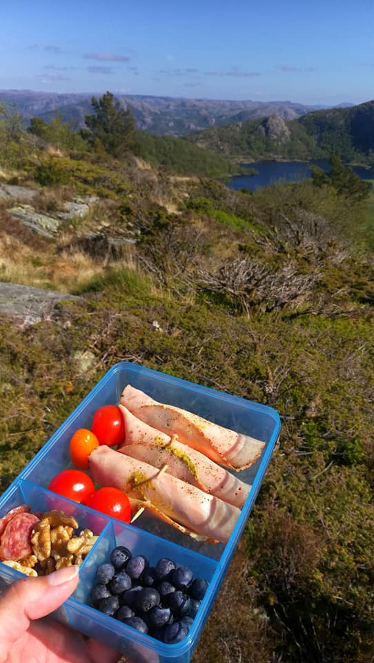 Det er ikke alltid like lett å vite hva man skal fylle matboksen med når man skal ut på tur. For meg er det viktig at innholdet i matboksen er variert, inneholder mye protein, litt fett, antioksidanter, er moderat på karb og holder meg mett over flere timer. Jeg drikker kun en kopp bulletproof kaffe før jeg går på topptur el og spiser ikke før jeg når toppen. Av og til må en bit mørk sjokolade og noen nøtter til i den hardeste kneika for litt refill av energi. Spesielt hvis det går mange timer fra morgenkaffen er inntatt.