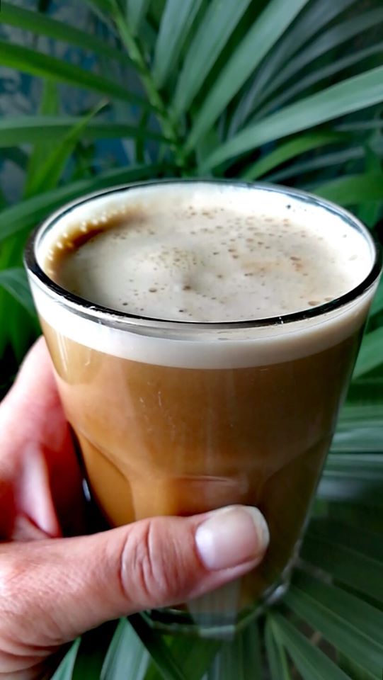 Ha alle ingrediensene i et desiliter mål og blend latten med en stavmikser i ca 30-40 sek. Helles over i et høyt glass og nytes mens den er varm.