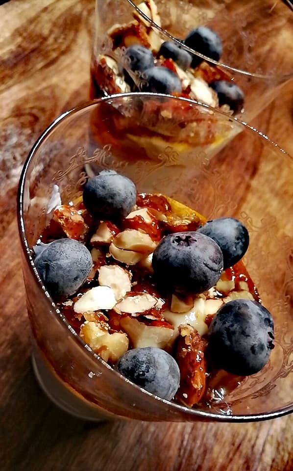 Ha ønsket mengde yoghurt i et glass. Hell over fibersirup, strø over hakkede nøtter og blåbær.