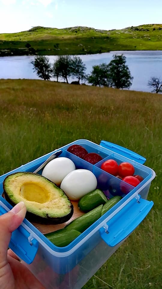 Enkel og grei matboks fylt med avokado, snackagurk piccolotomat, egg, taffelost, mør, majones og en mørk bit sjokolade. Riktig god tur og kos deg 🙂