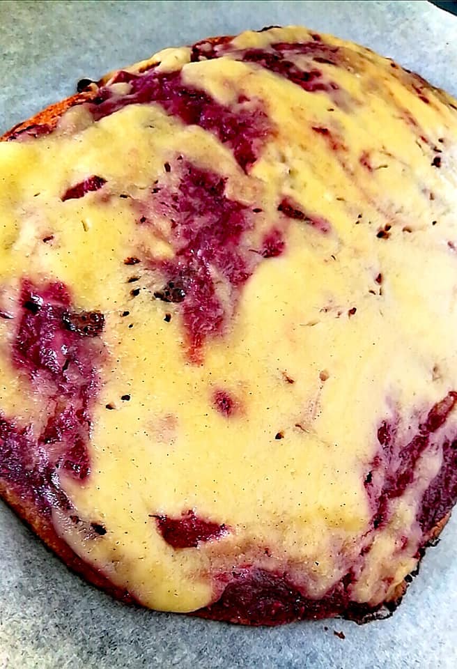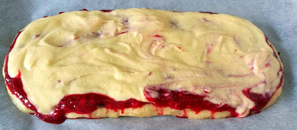 Tilsett mandelmel og egg og rør det godt godt inn. Bland inn litt nøytral olje slik at deigen slipper taket. Ha bakepapir på et stekebrett, hell litt olje på fingrene og form deigen som anvist på bildet. Deigen flyter litt utover under steking. Fordel sjokolade utover og dytt dem forsiktig nedi deigen. Bre først syltetøy utover og så vaniljekremen. Stekes midt i ovnen på over og undervarme i 180 grader i 20-25 min.