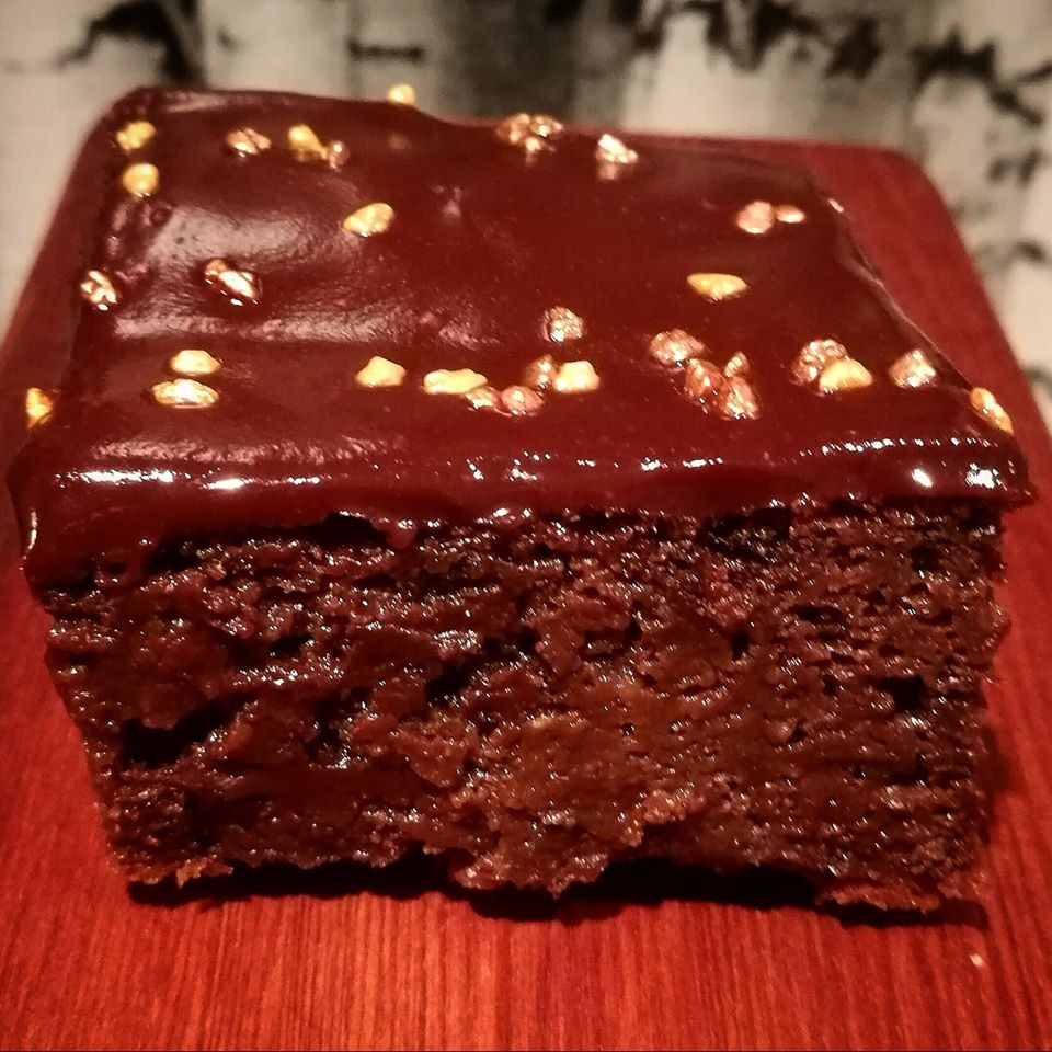 Kjøres på full guffe til en jevn røre. Tilsett grovhakket sjokolade og kjør maskinen på fullt til små sjokoadebiter. Hell røren i en mellomstor og avlang form kledd med bakepapir. Formen må være ca halvparten av en liten skuffekake. Spray formen med formfett/smør slik at bakepapiret fester seg til kanten. Fukt bakepapiret under varmt vann og skvis ut vannet, da blir det enkelt og forme. Hell røren over i formen og stek kaken på 175g midt i ovnen på over og undervarme i 2o-25 min. Kaken er ferdig når den beveger seg litt når du rister på stekebrettet. La kaken avkjøle seg til den synker. Da prikker du forsiktig hull med en gaffel før du heller over chilisjokolade og brer den jevnt utover. Sett kaken til avkjøling i kjøleskapet til den er kald.