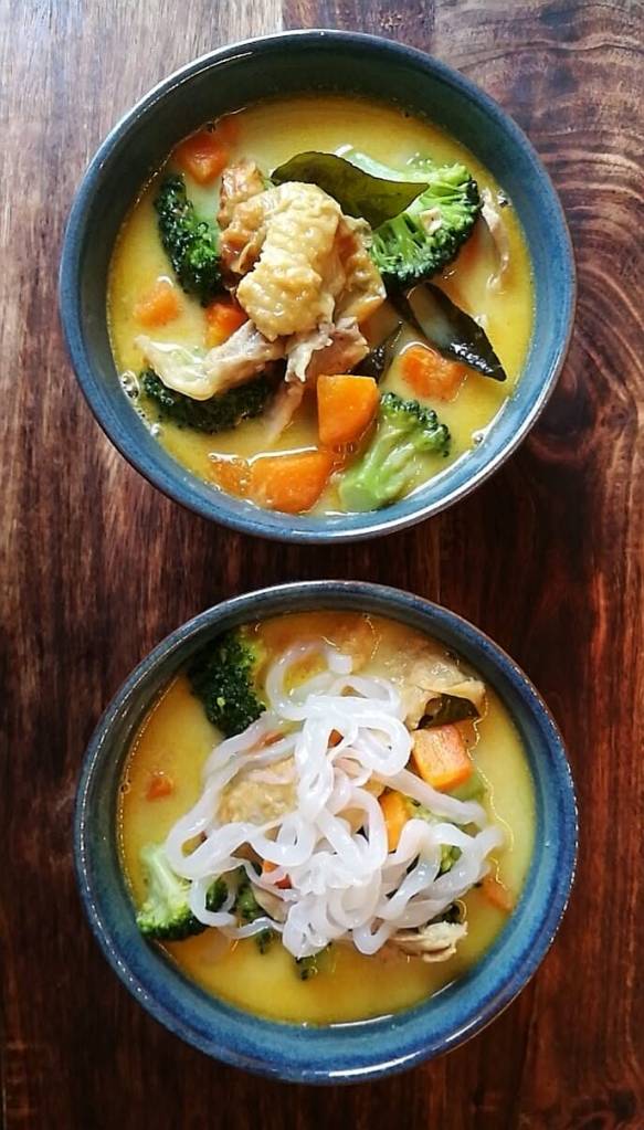Kok opp kraften og tilsett kokosmelk, fløte og alt krydder utenom salt og pepper. La suppen reduseres litt før du tilsetter grønnsaker og lar den koke ca 5 min. Tilsett pofiber eller johannesbrødkjernemel til ønsket konsistens og la det koke godt inn til det tykner. Smak til med salt og pepper og tilsett kyllingkjøtt rett før servering. Skyll konjakknudlene godt og fordel de i suppeskåler. Tilsett suppe og server.