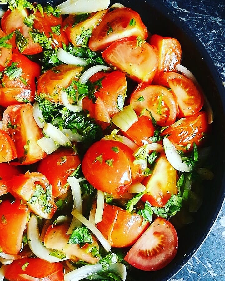 Finn frem en stekepanne og tilsett olivenolje. Ha oppi tomater, løk og hvitløk. La det surre under omrøring i 2-3 min. Tilsett Vegeta/aromat og vend det inn. Smak til med pepper, hell over fibersirup og rør om. La det steke til tomatene faller lett sammen. Strø over finkuttet sellerirotblader eller bladpersille og vend det forsiktig inn. Serveres med en gang. Retten kan også toppes med litt grovhakket kapers hvis den serveres til fisk eller annen sjømat. Velbekomme.