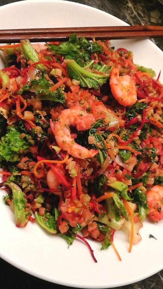 Stek scampi lett sammen med hvitløk, fibersirup og tilsett chilisaus. Sett til side. Fres brokkoliris i litt olje og smør sammen med grønnkålmiks i et par min. Tilsett scampi, vegetakrydder, litt vann og la det koke inn. Pass på å få med all chilisausen. Smak til med salt, pepper og mer chilisaus om ønskelig. Serveres med en gang og gjerne med en smørklatt på toppen.