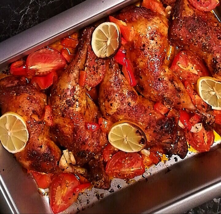 Bland sammen krydder i en skål og legg kyllinglår i en ildfast form. Strø krydder over lårene og gni det inn i kjøttet. Fordel tomater og paprika i formen. Hell olivenolje over det hele og tilsett oen klatter baconfett eller smør. Skvis over sitron, hell over fibersirup og topp med sitronskiver. Stekes midt i ovnen på varmluft på 200 grader i 30-40 min alt etter str på lårene. Avslutt med grill de siste 5 min for ekstra sprøtt skinn. Kjøttet er ferdig når det renner klar kjøttsaft ut ved å stikke i kjøttet med en spiss kniv.
