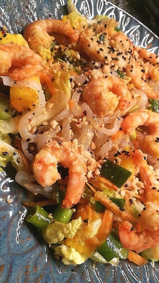 Kutt opp alle grønnsaker og mango og ha dem i en bolle. Tilsett litt olje, sesamfrø og ønsket mengde finhakkede peanøtter. Smak til med salt og pepper og bland salaten godt. Kok opp vann og tilsett buljong og litt salt. Skyll nudlene godt i kaldt vann i en sil og la dem trekke i buljongen i ca 5-7 min. Nudlene skal ikke koke.