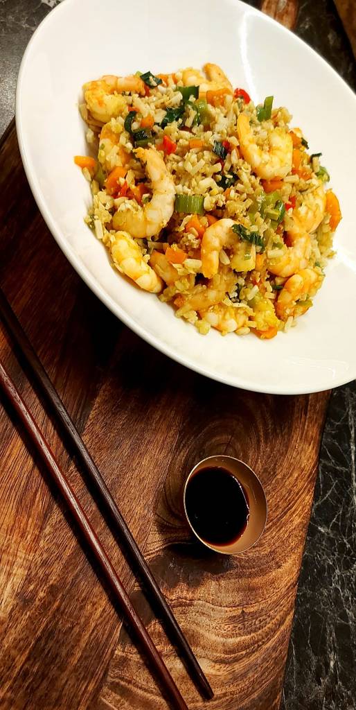 Fres gulrot, papika, løk, chili og vårløk lett på pannen i litt olje. Tilsett krydder og la det surre litt til. Så har du oppi scampi, en god klatt smør og lar det frese videre i 1 min. Tilsett blomkålris og smak til med salt og pepper. La det hele steke videre til blomkålrisen er gjennomvarm.