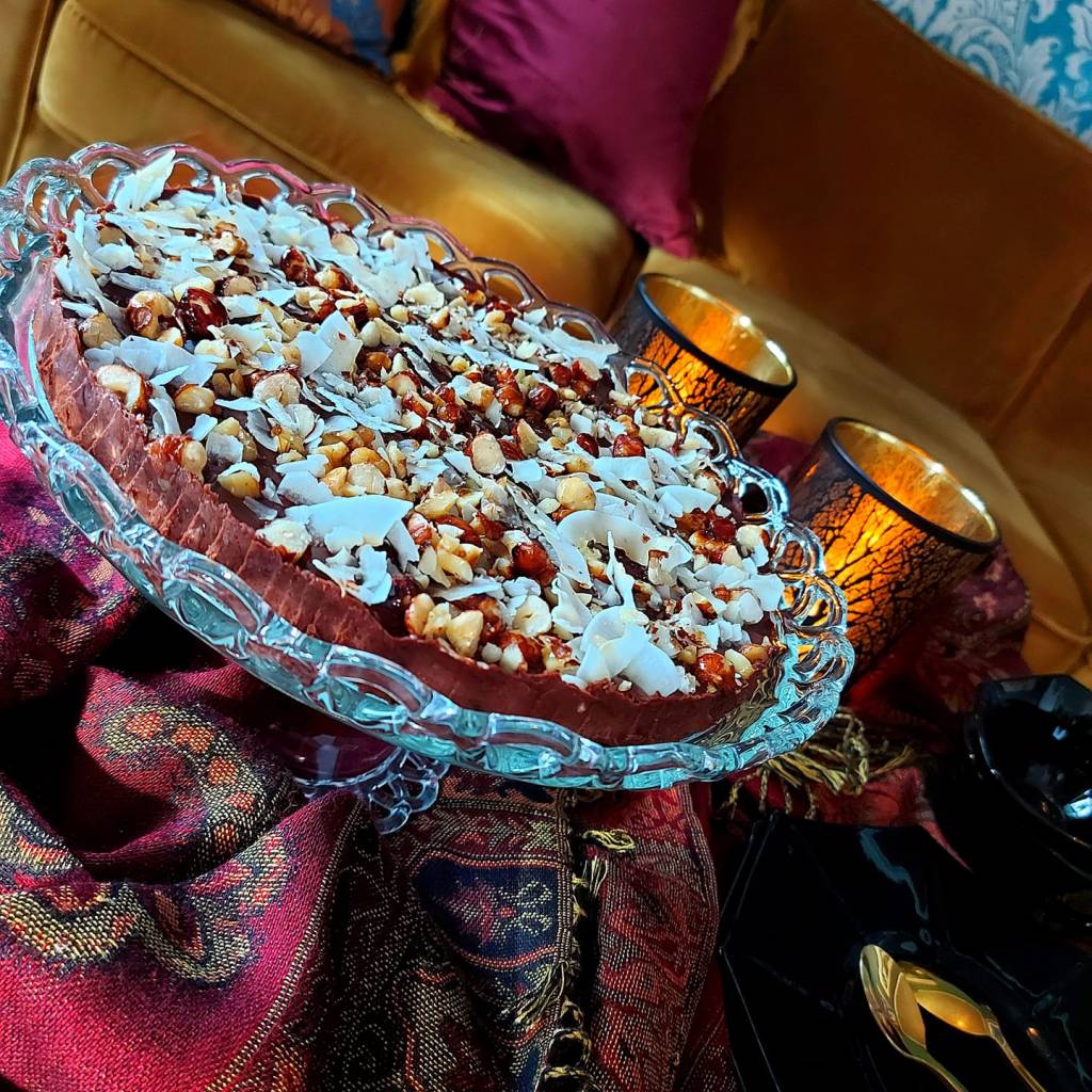 Kok opp fløte og sukrinmelis. Senk varmen og tilsett sjokolade og smør i terninger. Rør til sjokolade og smør er helt smeltet. Tilsett en klypt havsalt og rør godt om. Rist hasselnøtter og peanøtter i en stor stekepanne til de er gylne og avgir lukt. Hell over 3 ss sukrinsirup og la det redusere helt. Avkjøl og hakk nøttene grovt og tilsett mesteparten av nøttene i sjokoladen og bland det godt sammen. Spar litt nøtter til toppingen! Kle en liten rund kakeform med bakepapir og spray eller smør formen med fett. Hell røren oppi kakeformen og bre den jevnt utover. Topp kaken med gjenværende nøtter og kokosflak. Dekk til med plastfilm og sett den i kjøleskapet i omtrent en time eller til sjokoladen har stivnet.