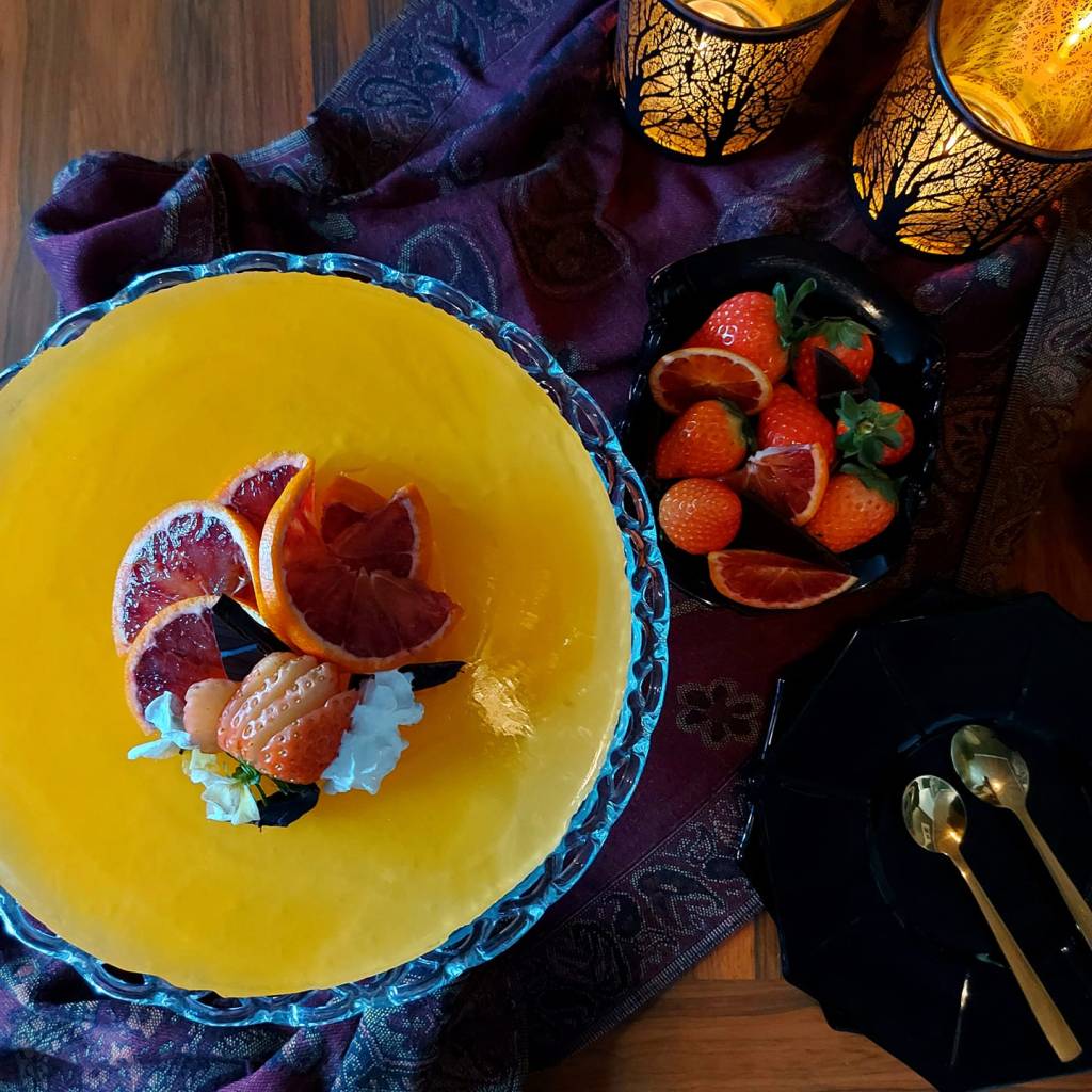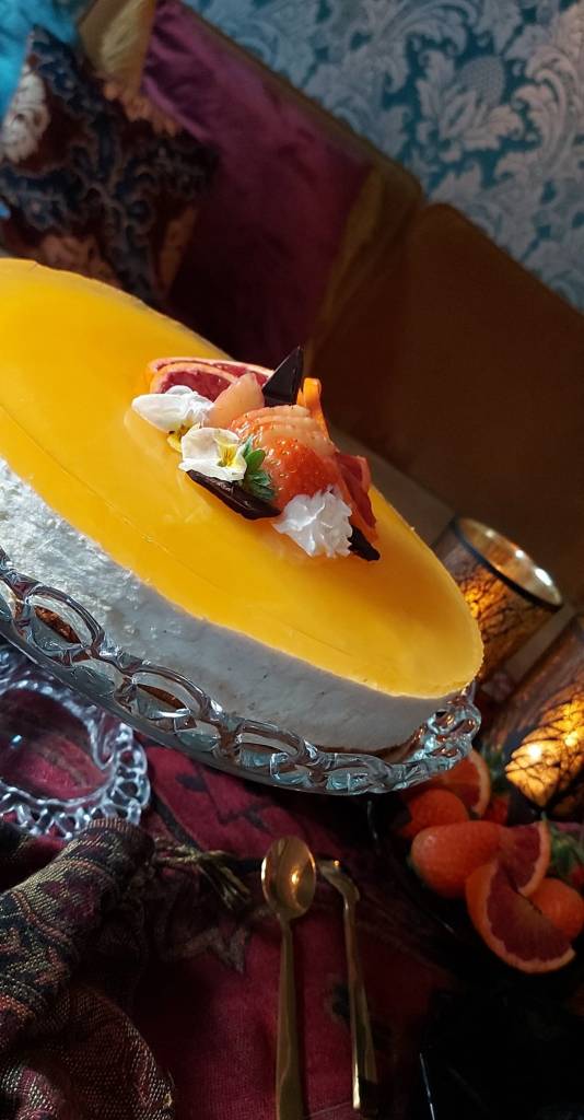 Varm opp litt av mangopureen og rør inn bløtlagte gelatinplater til gelatinen er oppløst. Tilsett blandingen i resten av mangopureen og hell det oppi kremosten. Visp godt med en elektrisk mikser eller manuel visp. Hell osteblandingen oppi kremen og vendt det kjapt inn. Bre kremen jevnt utover kaken og sett kaken til avkjøling i ca 3 timer hvorav de siste 15 min i fryser før du heller over gele og setter den tilbake på kjøl til geleen har stivnet.