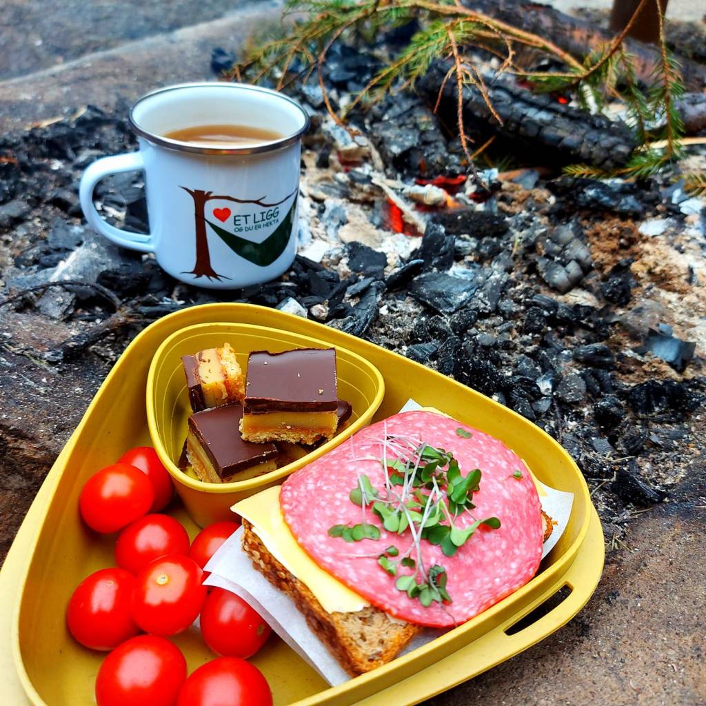 Hjemmebakt eller kjøpt lk brød, smør, valgfri ost og salami, smågrønt om du får tak i åsså tomater da og selvfølgelisg en raus porsjon med ustanselig god Twix 😛