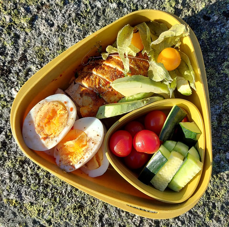 Kyllingbryst av ferdig grillet kylling, kaldpresset olivenolje og krydder av eget ønske, egg, avokado, agurk, tomat og physalis.