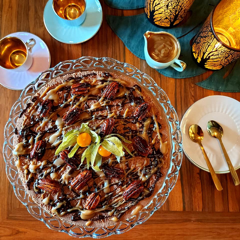 Løsne kaken langs kanten med en varm spiss kniv og fjern bakepapiret. Ha kaken over på et kakefat og smelt ca 50 gram sjokolade sammen med litt smør og la sjokoladen avkjøles til ca 37 grader. Hell sjokolade over kaken i et fint mønster. Varm lett opp karamellsausen under omrøring og hell ønsket mengde over kaken. Resten serveres ved siden av i en fin liten mugge om du har. Topp med pekannøtter og server med en god kopp kaffe eller te.