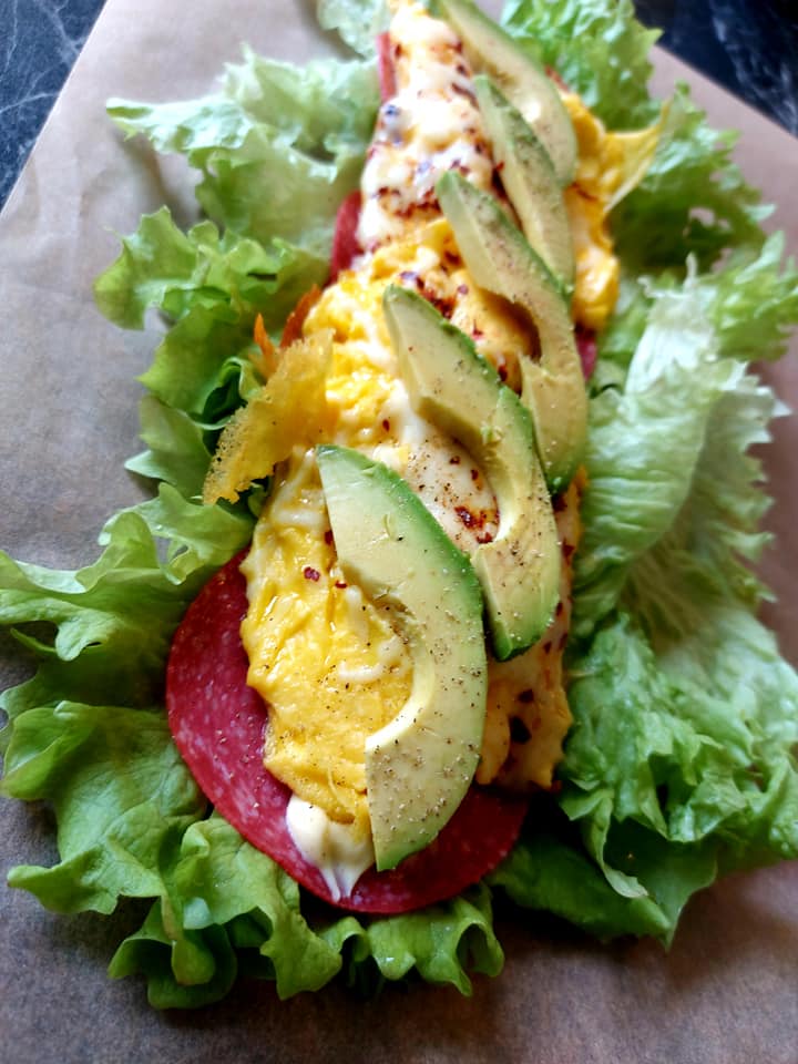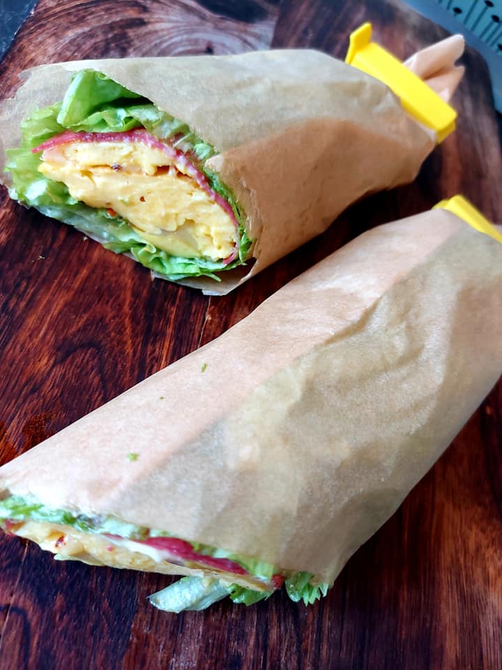 Ha egg, fløte og salt i et syltetøyglass og rist til alt blander seg. Du kan selvfølgelig piske det sammen i en bolle. Stek eggerøren sammen med en god klatt smør. Når eggerøren er nesten ferdig stekt, strør du over ost og krydrer med chiliflakes. Bre salatblader utover en fjerdedel av et bakepapir, legg så på salami, majones el, eggerøre og avokado. Strø over litt pepper og salt om ønskelig. Rull wrapsen sammen ved hjelp av bakepapiret og fest en poseklemme eller strikk på hver ende. Del wrapsen i to og du er good to go 😉