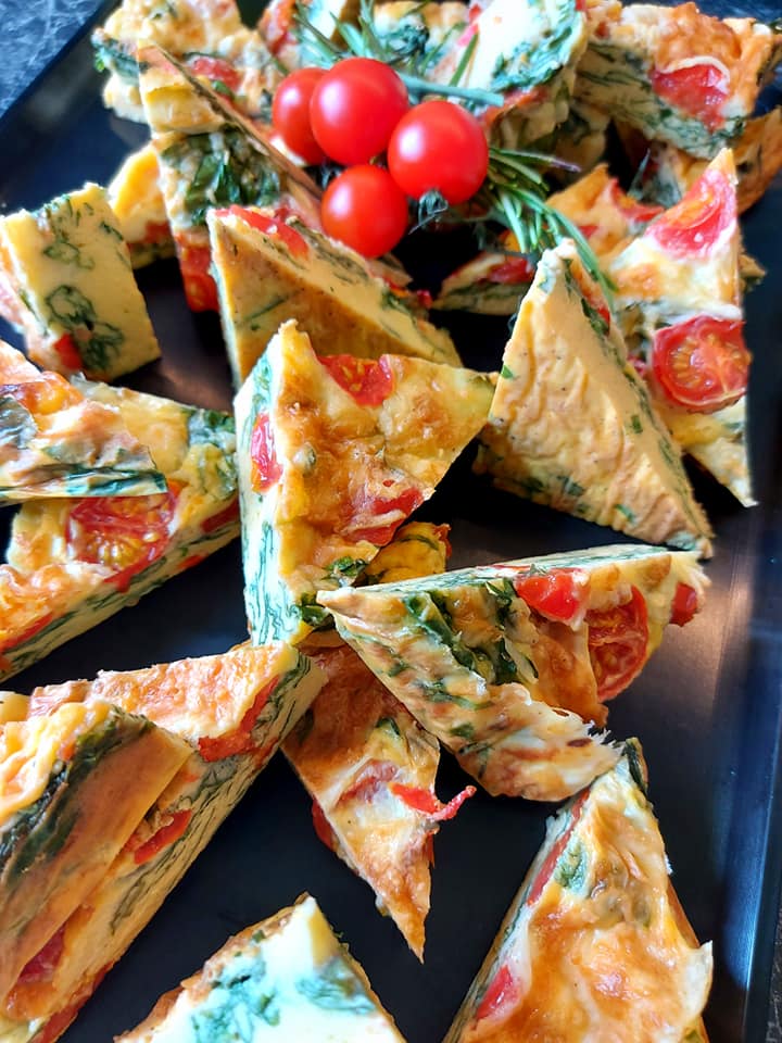 Dytt nedi tomater. Stekes midt i ovnen på over og undervarme på 200 grader i ca 20-25 min. Rist litt på fomen for å sjekke at den har satt seg. Beveger den på seg stekes den videre til den har satt seg. La den avkjøles litt før servering. Skal den deles opp i trekanter må den være kald før man skjærer i den. Frittata er like god lun som kald og kan varmes lett opp igjen.