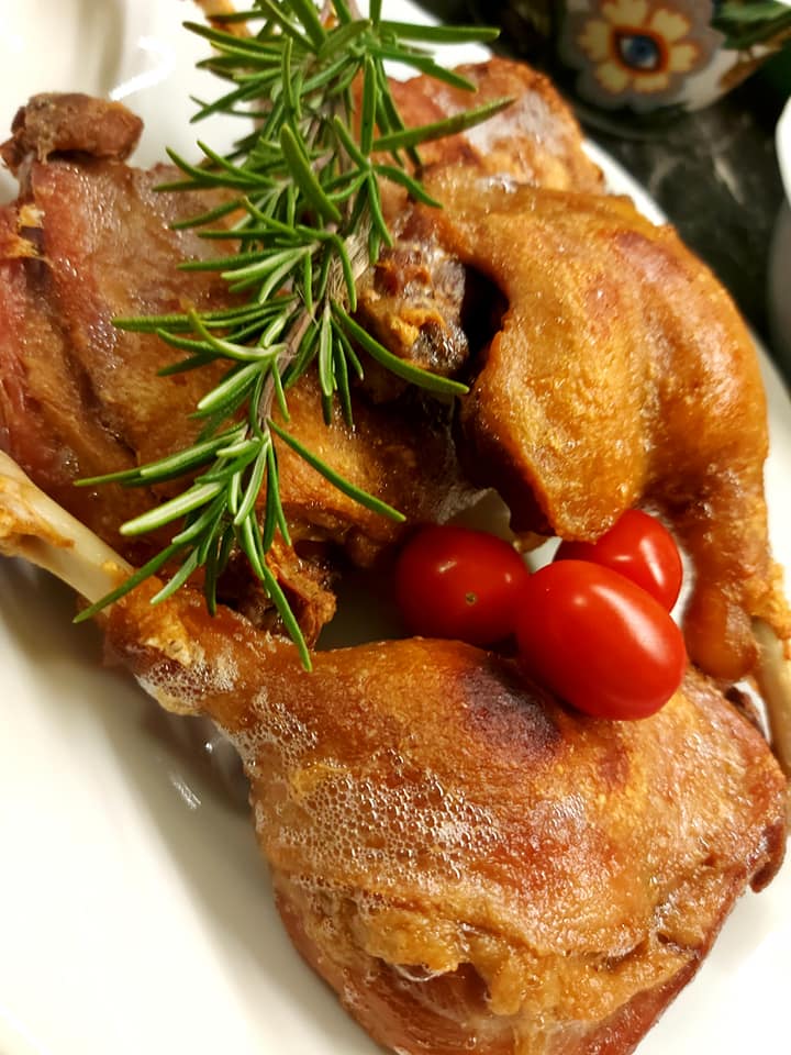 Rens andelår for fett ved å skrape det av med en kniv. Legg lår på en ovnsrist med et ovnsbrett under. Stek andelårene på 200 grader i 20 min. Etterstekes i 5 min med grillelement eller til skinnet er crispy! Følg med underveis og ha viften på full guffe.