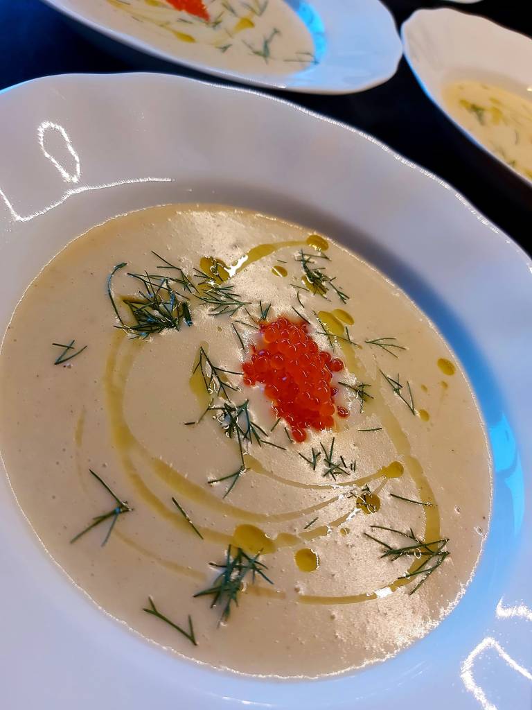 Rett før servering blender du suppen kjapt med en stavmikser til det danner seg et skum. Topp med litt kaldpresset olivenolje, finhakket fennikelblader og en raus teskje rogn i midten. Serveres gjerne sammen med frøloff, urtebrød eller focaccia som du finner oppskrift på, på bloggen under brød.