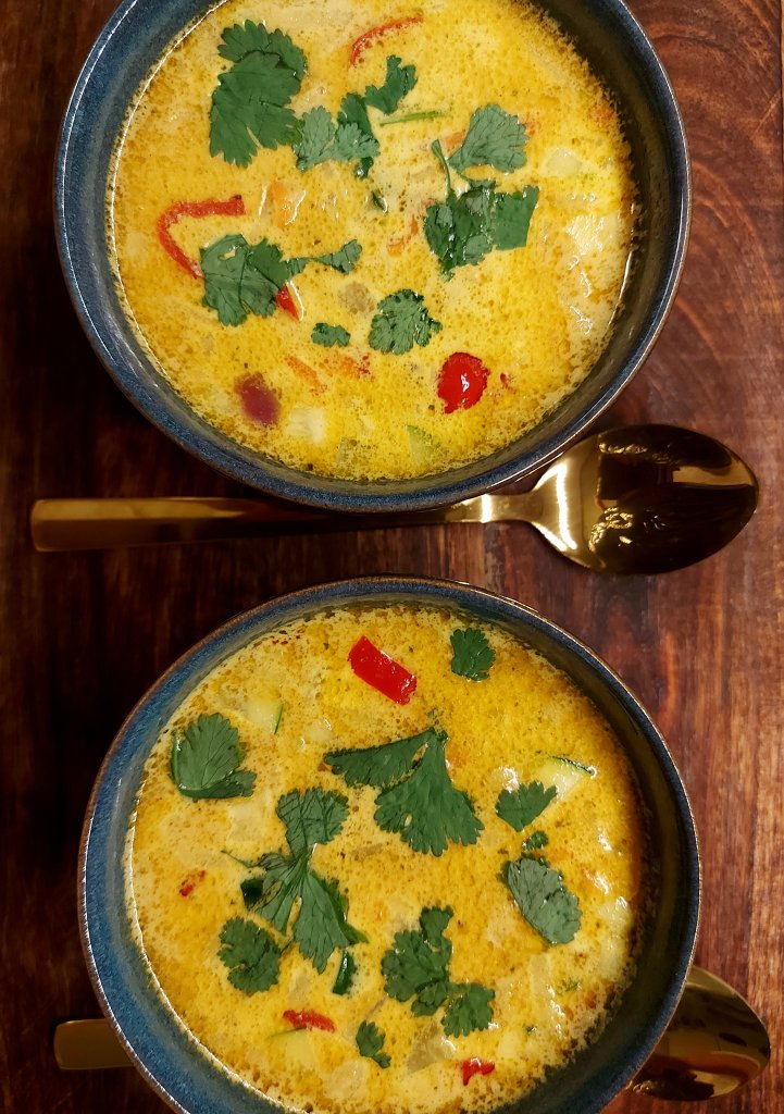 Stek kylling lett i smør. Tilsett løk, hvitløk og chili og la det frese litt. Tilsett alt av krydder utenom salt og la det frese videre til løken skifter farge. Så tilsetter du kyllingkraft/fond og lar det putre under lokk i ca 5 min. Hell oppi fløte eller kokoskrem og la det koke under lokk på svak varme til kyllingen er gjennomkokt. Til slutt tilsetter du grønnsaker, eple og revet ingefær og lar det putre videre i ca 3 min. Smak til med salt og mer spice om nødvendig. Serveres i dype skåler toppet med fersk koriander. Voila. Nydelig og varmende kyllingsuppe.