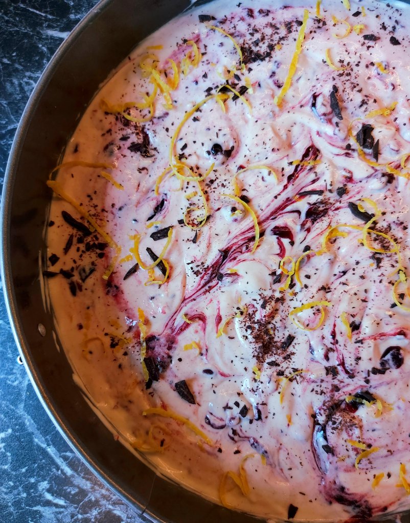 Tilsett sitronsaft og gelatin i eggedosisen under omrøring. Bland inn krem, revet sitronskall og rør forsiktig om. Vend så inn 3 ss solbærsyltetøy og hell fromasjen over kakebunnen. Bre fjomasjen jevnt utover og la den hvile i 3 min. Fordel 4-5 ts solbærsyltetøy utover kaken, og skjær inn syltetøyet med en gaffel eller satayspyd for å lage mønster. Strø over hakket sjokolade og revet sitronzest.