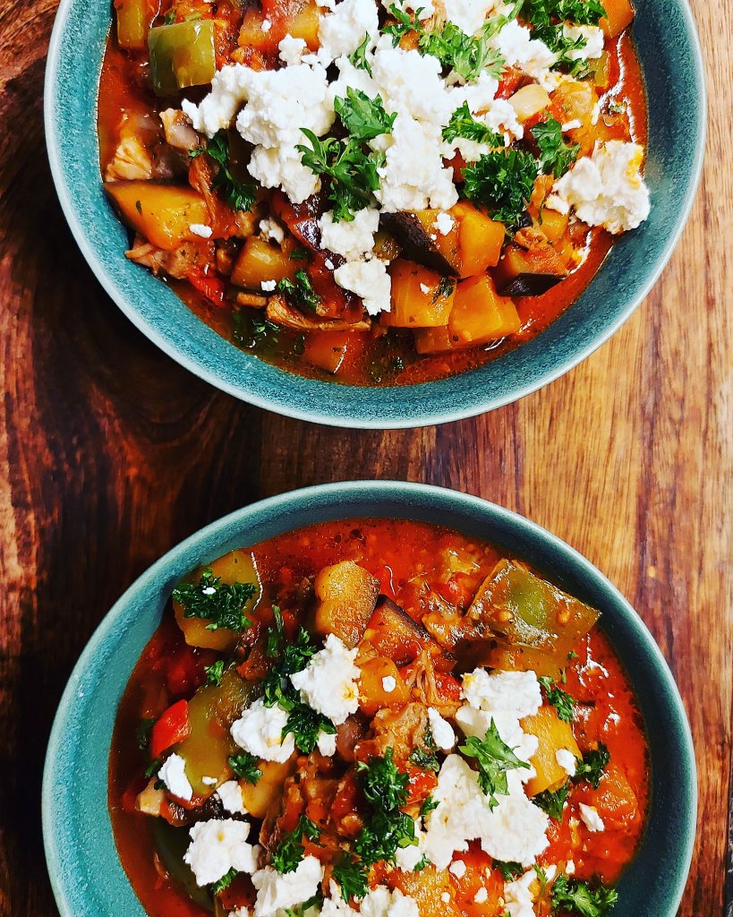 Serveres i dype skåler og toppes med resten av persillen og fetaost. Topp gjerne med en klatt youhurt naturell.