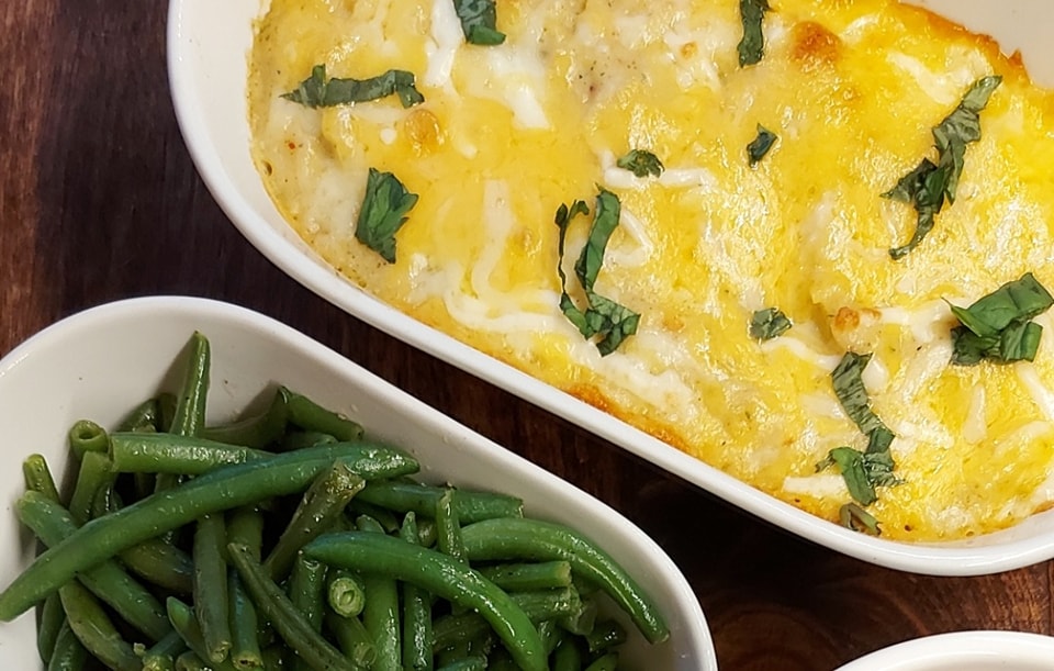Ha pureen over i en liten ildfast form/skål som tåler høy varme, og topp med resten av osten. Gratiner pureen midt i ovnen på 200 grader til osten er gyllen.
