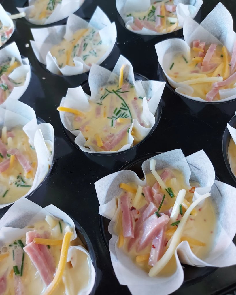 Pisk sammen alt utenom ost og skinke. I en annen bolle blander du sammen ost og skinke. Spray eller smør et muffinsbrett med sprayfett eller smør.