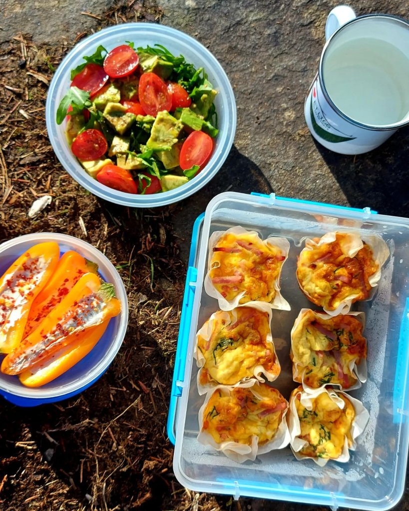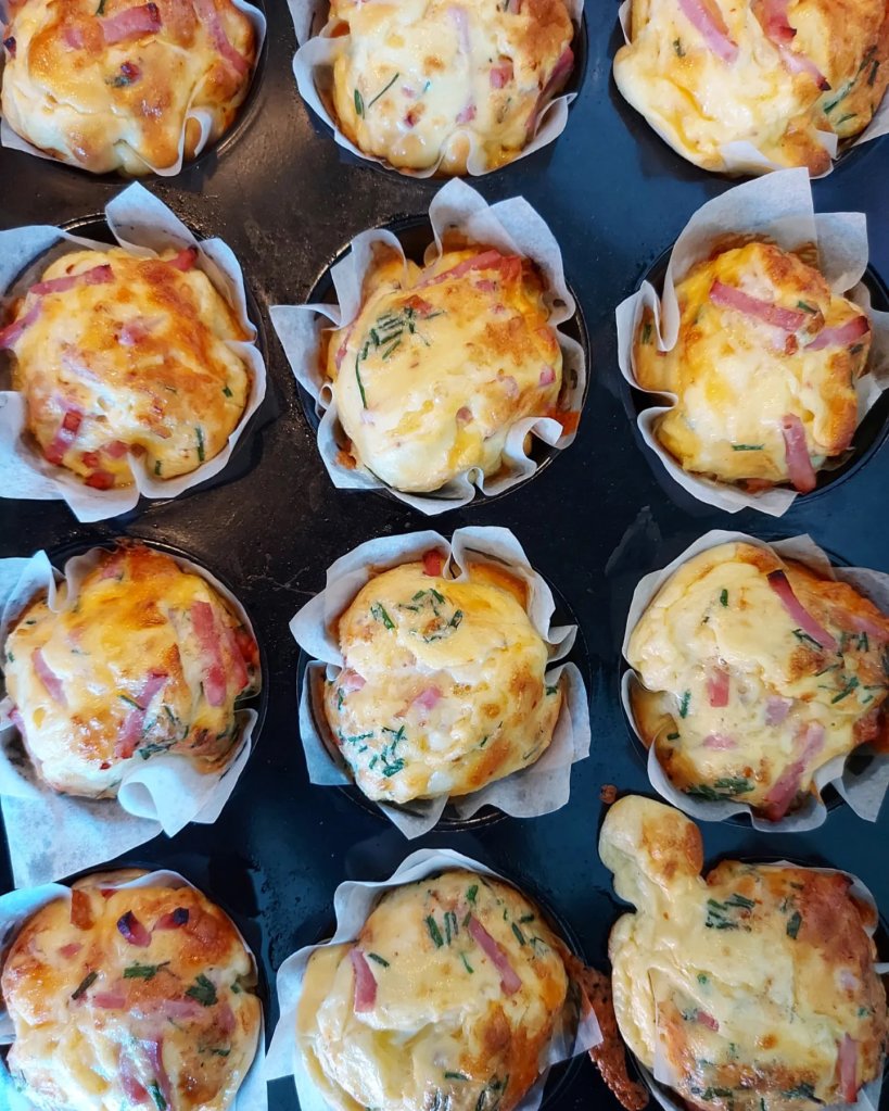 Stekes midt i ovnen på varmluft på 200 grader i 12-15 min. Trykk omeletten litt ned for å teste om den er helt gjennomstekt. La omeletten avkjøles litt før du pakker de med deg.