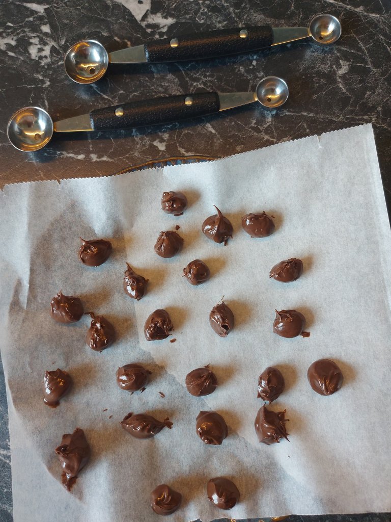 Sett protinella i kjøleskap eller på frys slik at den er kald. Lag små kuler med kulejern om du har, eller bruk en teskje. Sett kulene på en tallerken med bakepapir. Frys kulene til de er halvfrosne.