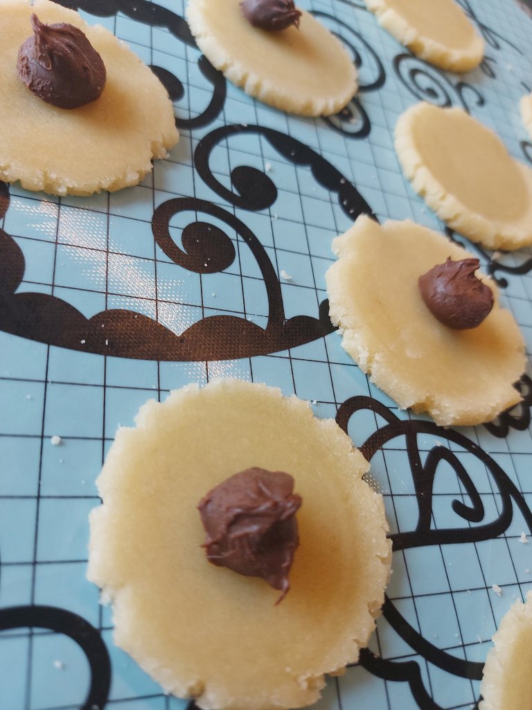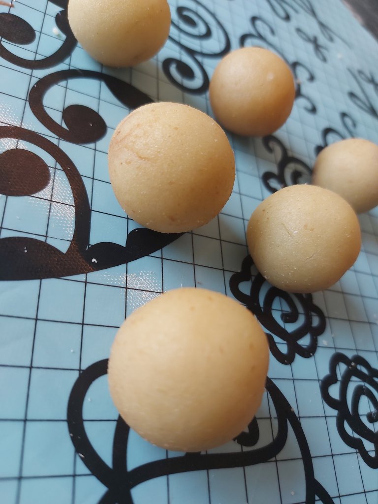 Del opp marsipan i like store biter. Bitene må ha litt størrelse. Trill ut kuler og trykk de flate med et glass. Husk bakepapir mellom glass og marsipan.