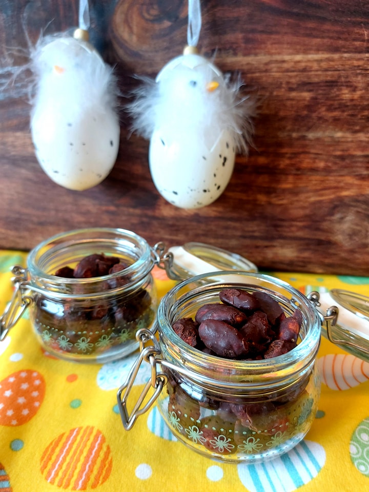 Smelt sjokolade i mikro eller over et vannbad. Tilsett nøtter og bland alt godt sammen. Spre nøttene utover en tallerken som du har latt stå på frys i ca 15-20 min. Sett tallerkenen tilbake på frys til sjokoladen har stivnet. De kan også settes i kjøleskapet.
