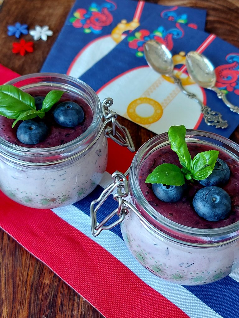 Hell over pure og pynt av hjertens lyst. Jeg har brukt blåbær og basilikum.