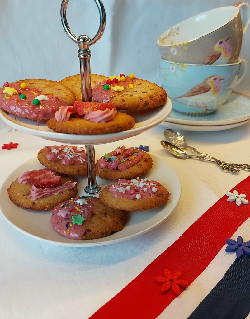 Pynt cookies etter hjertets lyst. Jeg har dyppet noen i sjokolade, laget mønster, hatt på strøssel og jordbær. Noen har også glasur iblandet frysetørkede jordbær.