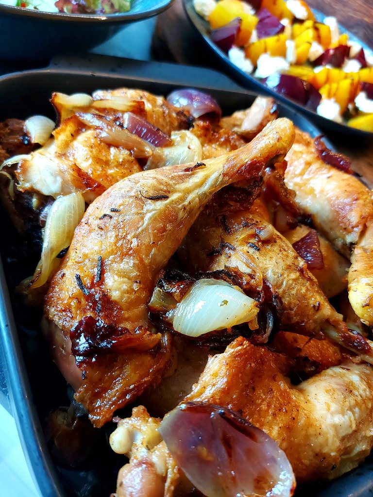 Stekes midt i ovnen på 200 grader på varmluft i ca 40 min eller til skinnet er gyllent og crispy.